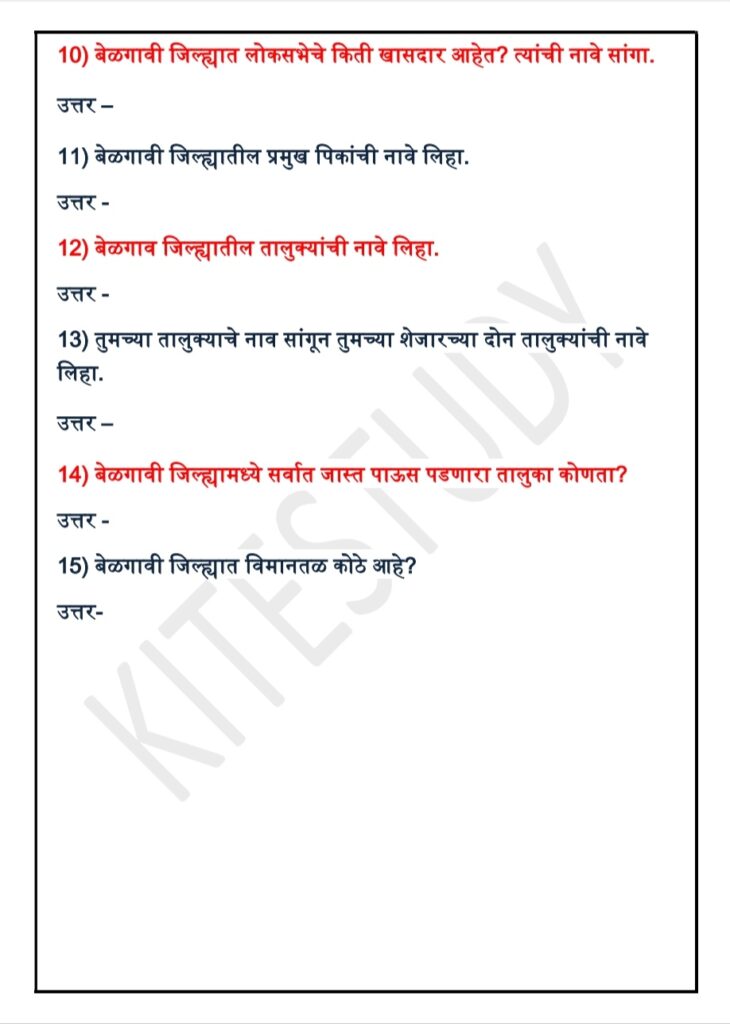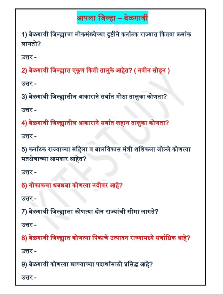 आपल्या सर्वांना आपल्या बेळगावी जिल्ह्याबदल माहिती असणे आवश्यक आहे. आपला बेळगावी जिल्हा सुखी आणि समृद्ध आहे. येथील वातावरण थंड असल्याने याला गरिबांचे महाबळेश्वर असे म्हटले जाते. बेळगावी जिल्ह्याच्या महत्वाच्या माहितीच्या आधारे खाली प्रश्नमंजुषा दिलेली आहे. जी ONLINE किंवा PDF DOWNLOAD करून अश्या दोन्ही पद्धतीने सोडविता येईल.