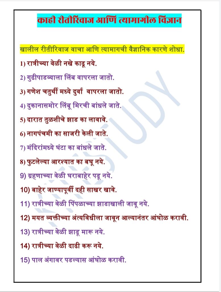 लहानपणापासुन आपल्याला घरातील वडीलधारी माणसे काही रितीरिवाज सांगत असतात. काहीवेळा आम्हाला त्यांची चीड येते. पण त्यातील बर्याच गोष्टींमागे विज्ञान असते. हे माहिती करून घेतले पाहिजे. खाली दिलेले पहा आणि उत्तरे प्रयत्न करा.